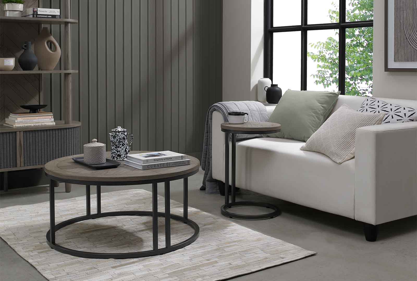 The Montrose Collection features saw-cut ash tops in a striking chevron pattern, tapered legs or peppercorn metal frames and textured tambour doors to complement the palette and add texture for refined sophistication.
