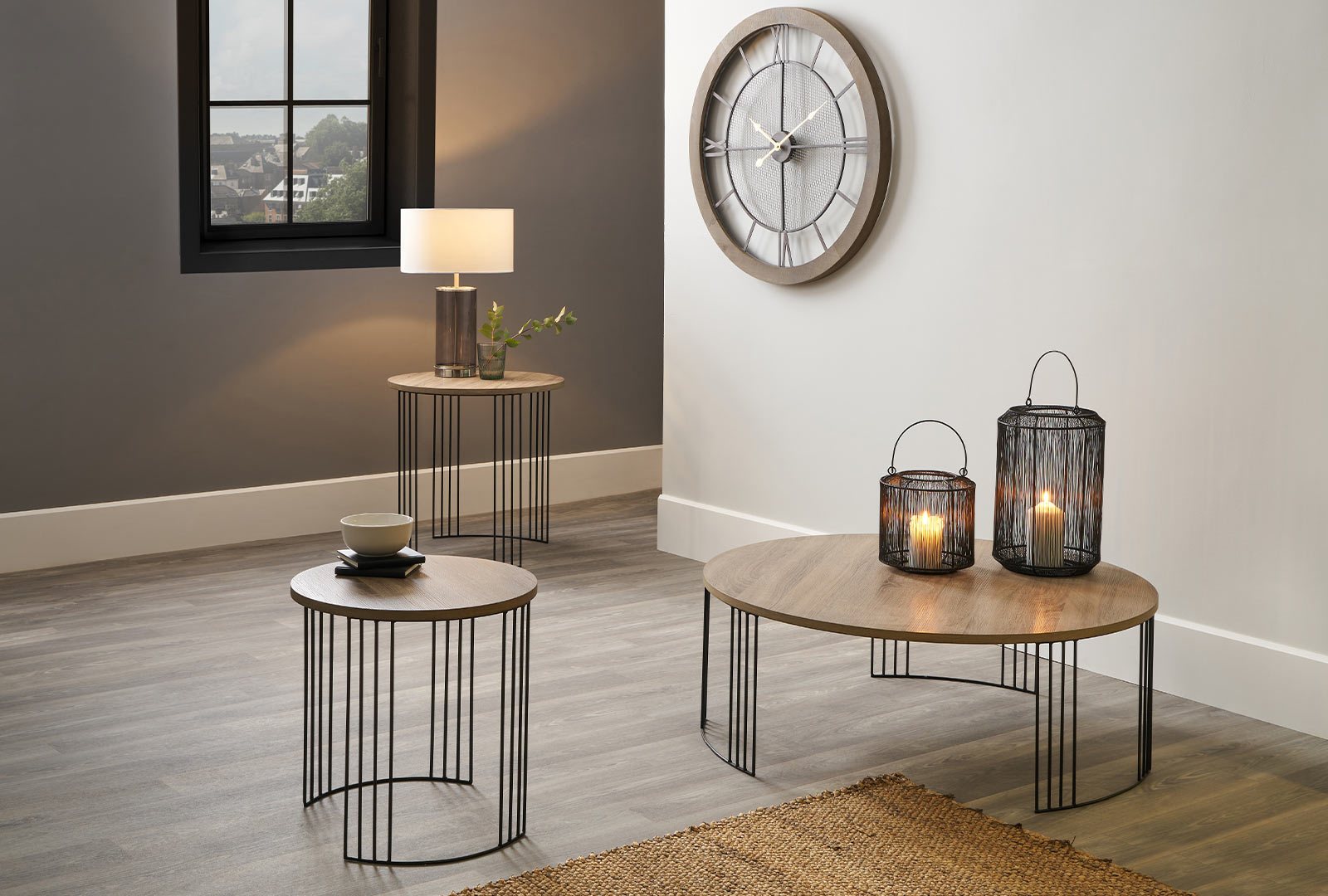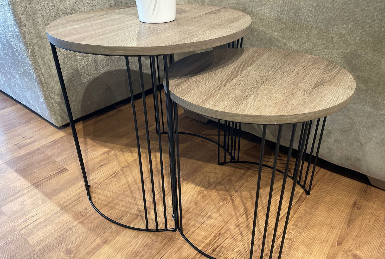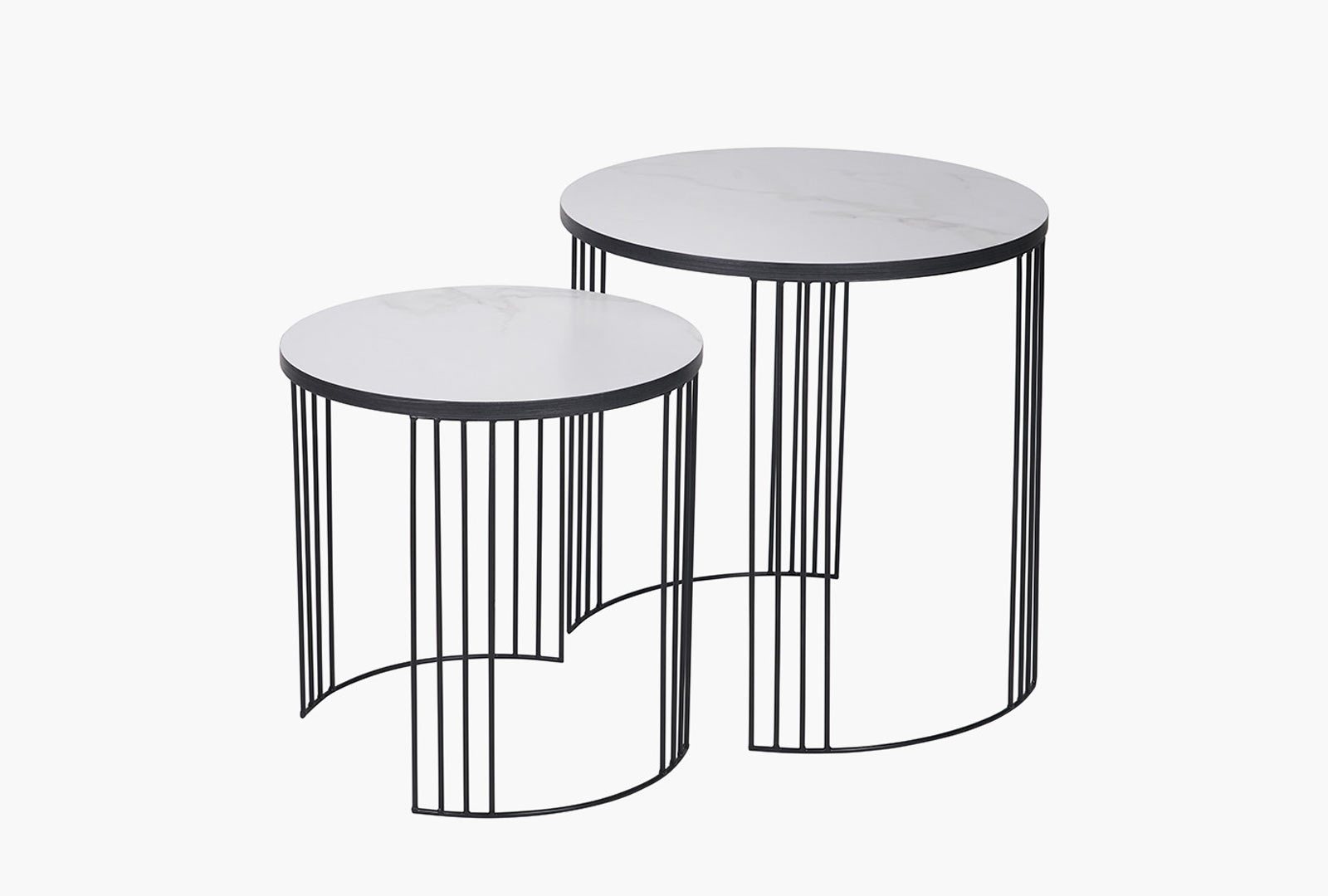 Perfectly proportioned, sleek modern tables with oak wood or white marble effect top and contrasting black metal legs.