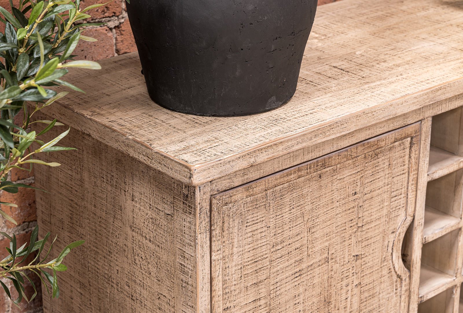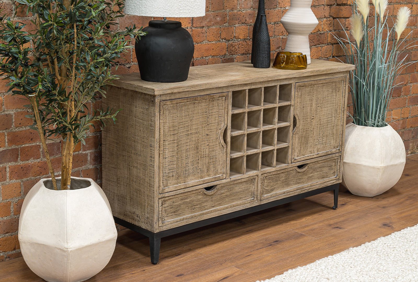 Rustic, raw, and refined—the Marlborough Large Sideboard with Wine Rack combines rich texture with bold architectural form. Angular black iron handles and feet tie the look together, blending rustic charm with industrial strength.