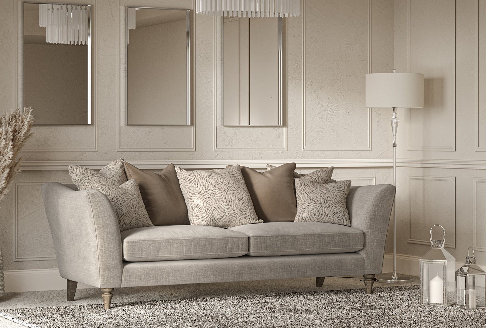 Available as a formal standard back or a relaxed pillowback to suit your preference. Deep dual-density foam seats offer springy, shape-holding support that gently envelops. Fibre-filled back cushions arch towards the centre, creating a subtle lift and a light, tailored profile. Slim, splayed arms dip in the middle for a sculpted touch, while matching or accent scatters complete the look.