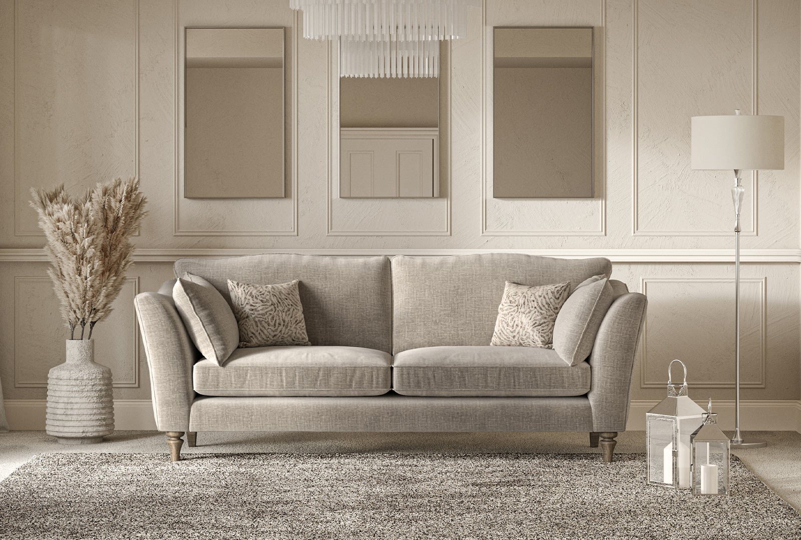 The dual-density foam seats offer springy, shape-holding support with a gently enveloping sit. Fibre-filled back cushions arch towards the centre, creating a subtle lift and a light, tailored profile. Choose from a formal standard back or a relaxed pillowback to suit your space. Slim, splayed arms dip in the middle for a sculpted touch, while matching or accent scatters add a soft, styled layer.