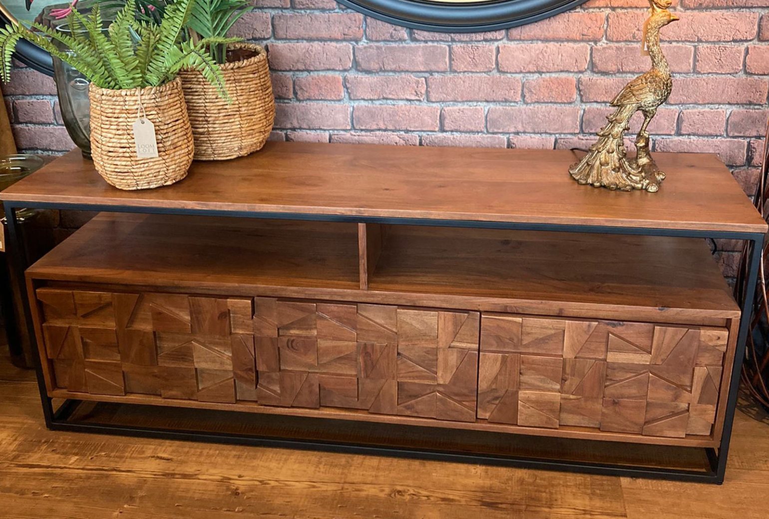 The Atticus range has a cool loft living vibe with its bold metal framing and carved Acacia wood. The block design is carved in such a way to offer different levels and shapes to allow the light to highlight different sections creating a unique conversation piece.
