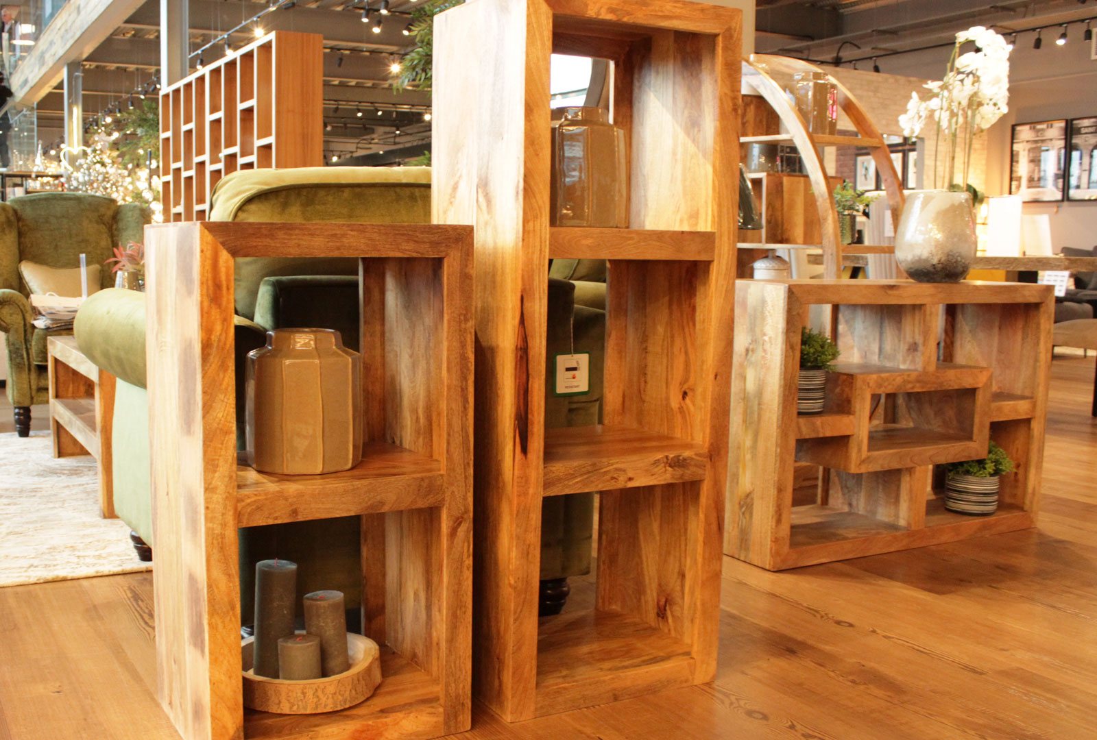 Images show Cuban Cube Shelving Unit in Mango, Rosewood and Sheesham wood.