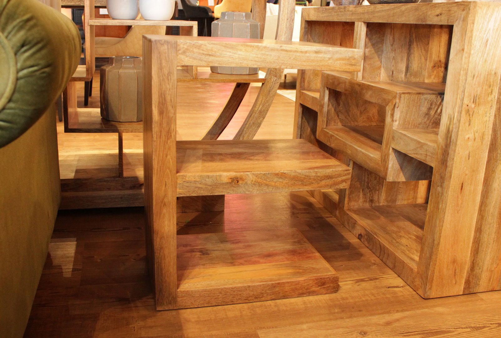 Images show Cuban E Table / 'E' Shelving unit in Mango, Rosewood and Sheesham wood.
