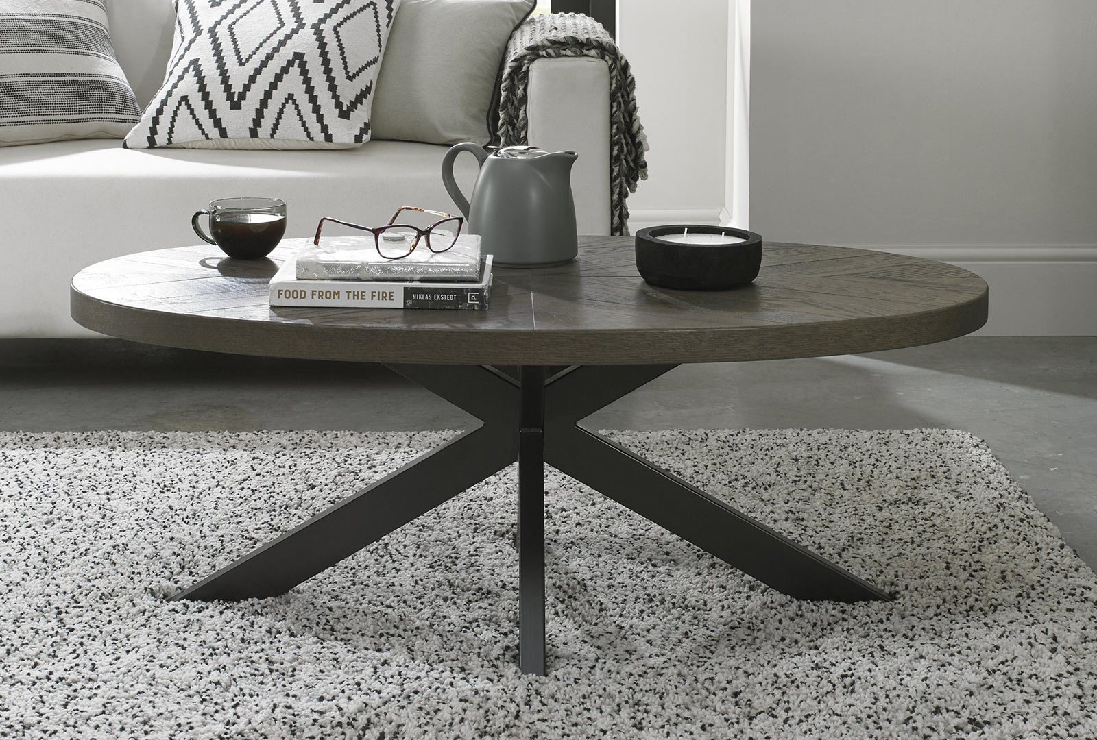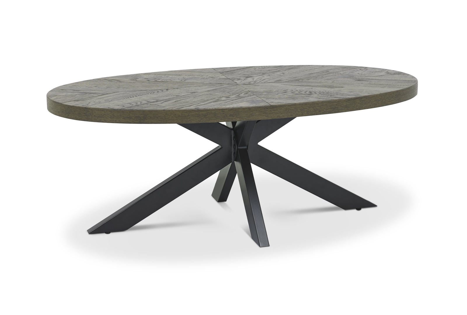 A handcrafted herringbone table top rests on a sculptural black cross-leg metal base, blending homely and industrial aesthetics. The tactile, wire-brush finish accentuates the unique oak grain, available in your choice of fumed or rustic tones.