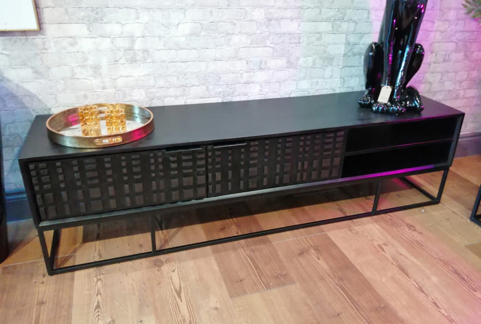 The Fuse occasional range brings together strong bold black powder coated metal framing and dramatic carved Mango wood. With a unique linear design stained to a rich dark colour, this stunning collection will add interest and flair to any interior.