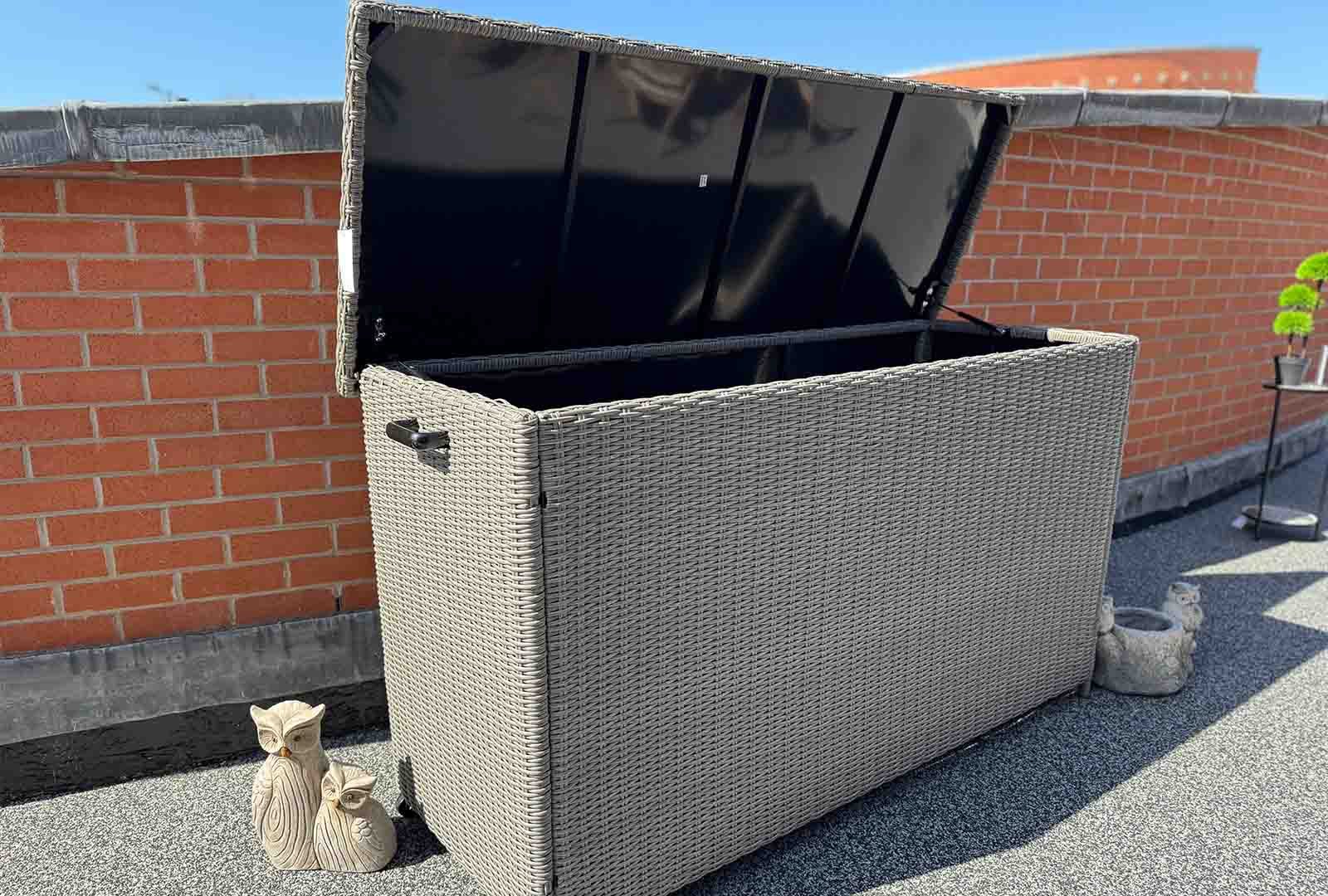 Keep your garden space tidy and stylish with the Slate Grey Outdoor Storage Box—a generous, waterproof garden storage box made from durable synthetic rattan. Designed to complement your outdoor furniture, it offers a smart solution for cushion storage without compromising on looks.