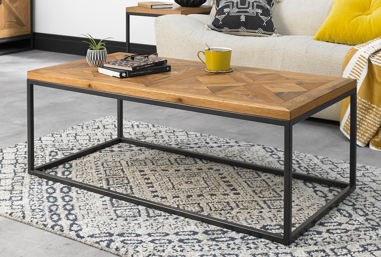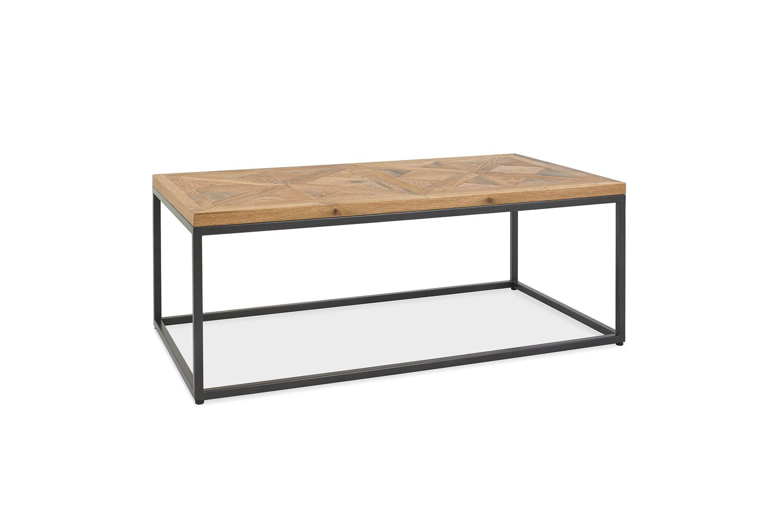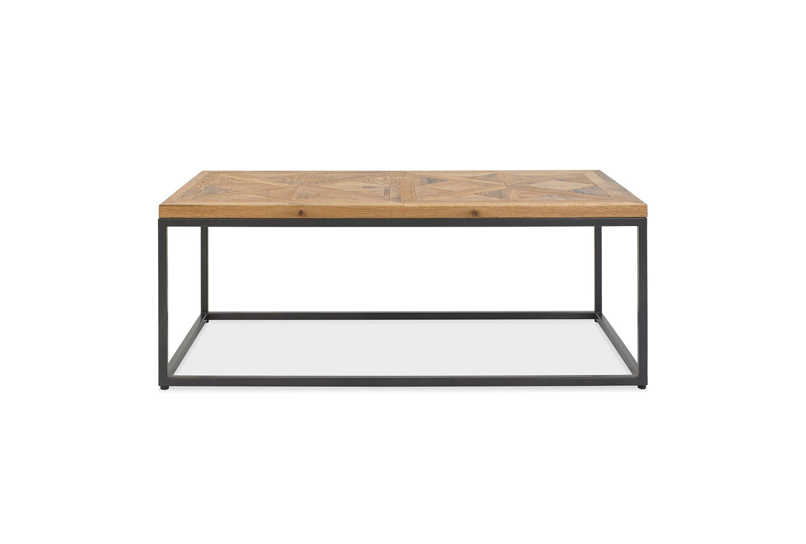 The Ingot Collection showcases a bold design, featuring rustic oak marquetry tops paired with a wire-brushed oak veneered frame in a 'peppercorn' finish. Its welded black powder-coated metal base lends an on-trend industrial touch whilst each handcrafted top is wire-brushed and distressed, highlighting the beautiful, varied grain of oak for a rustic and tactile appeal.
