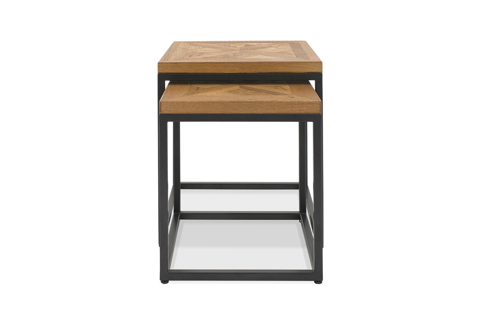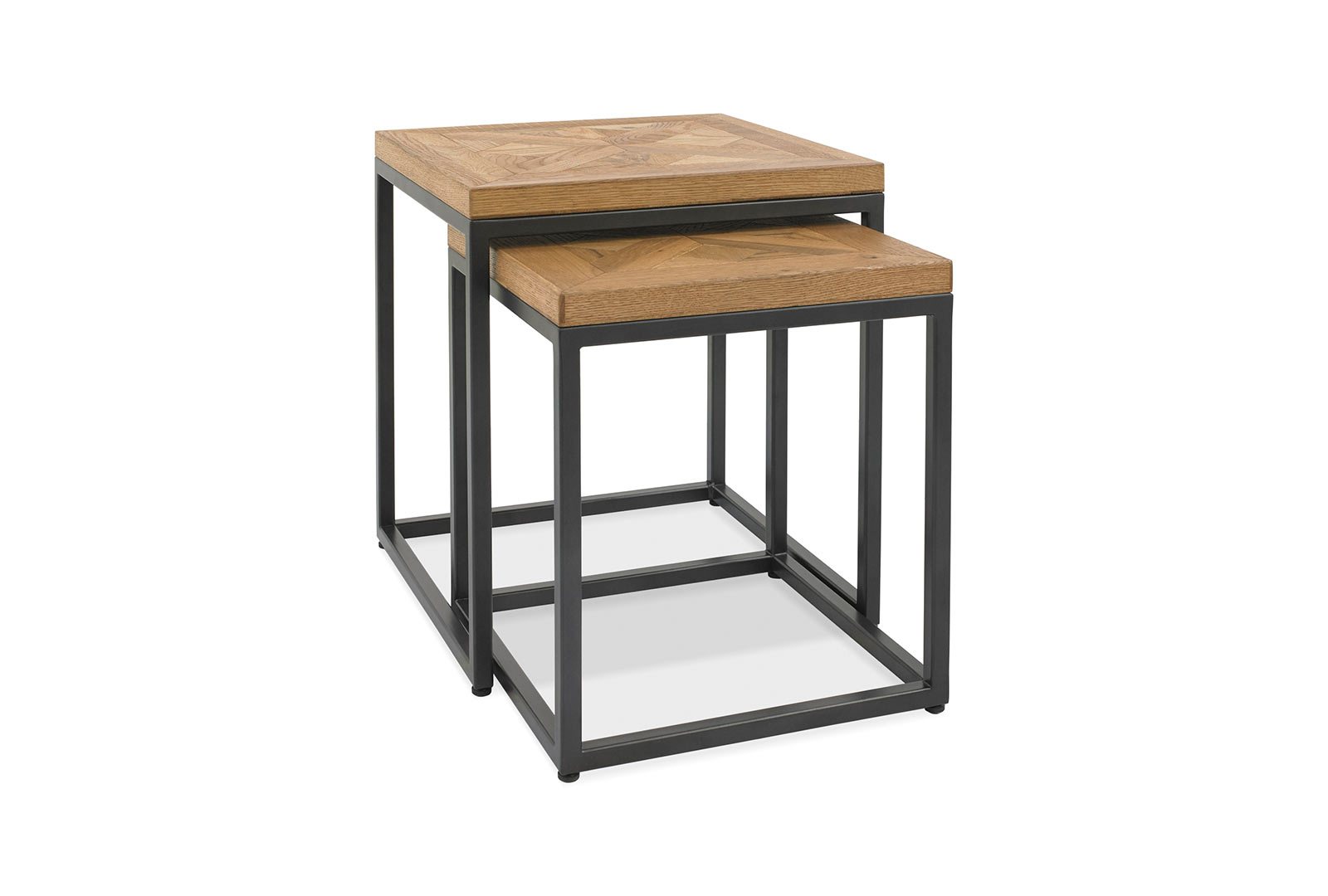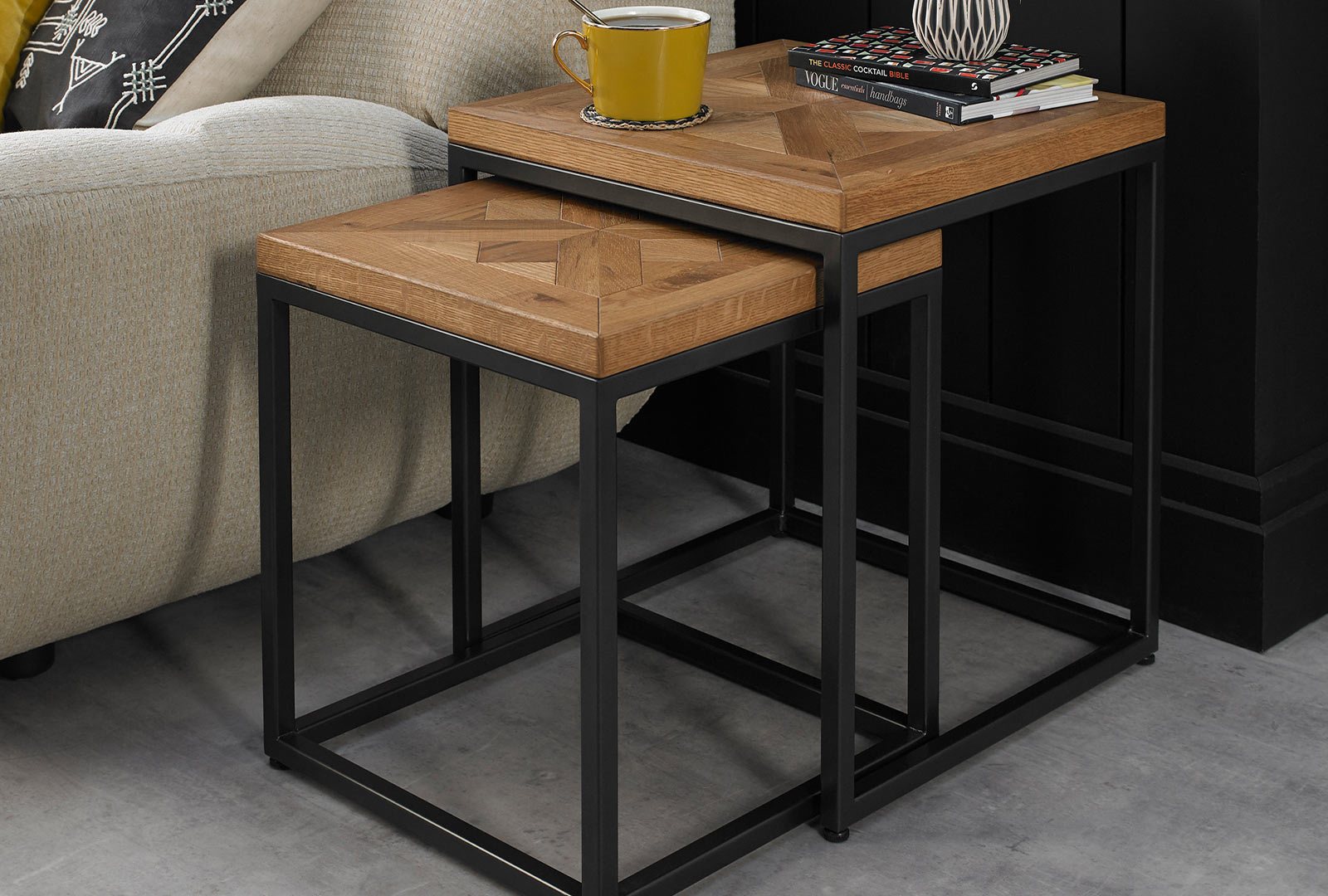 The Ingot Collection showcases a bold design, featuring rustic oak marquetry tops paired with a wire-brushed oak veneered frame in a 'peppercorn' finish. Its welded black powder-coated metal base lends an on-trend industrial touch whilst each handcrafted top is wire-brushed and distressed, highlighting the beautiful, varied grain of oak for a rustic and tactile appeal.