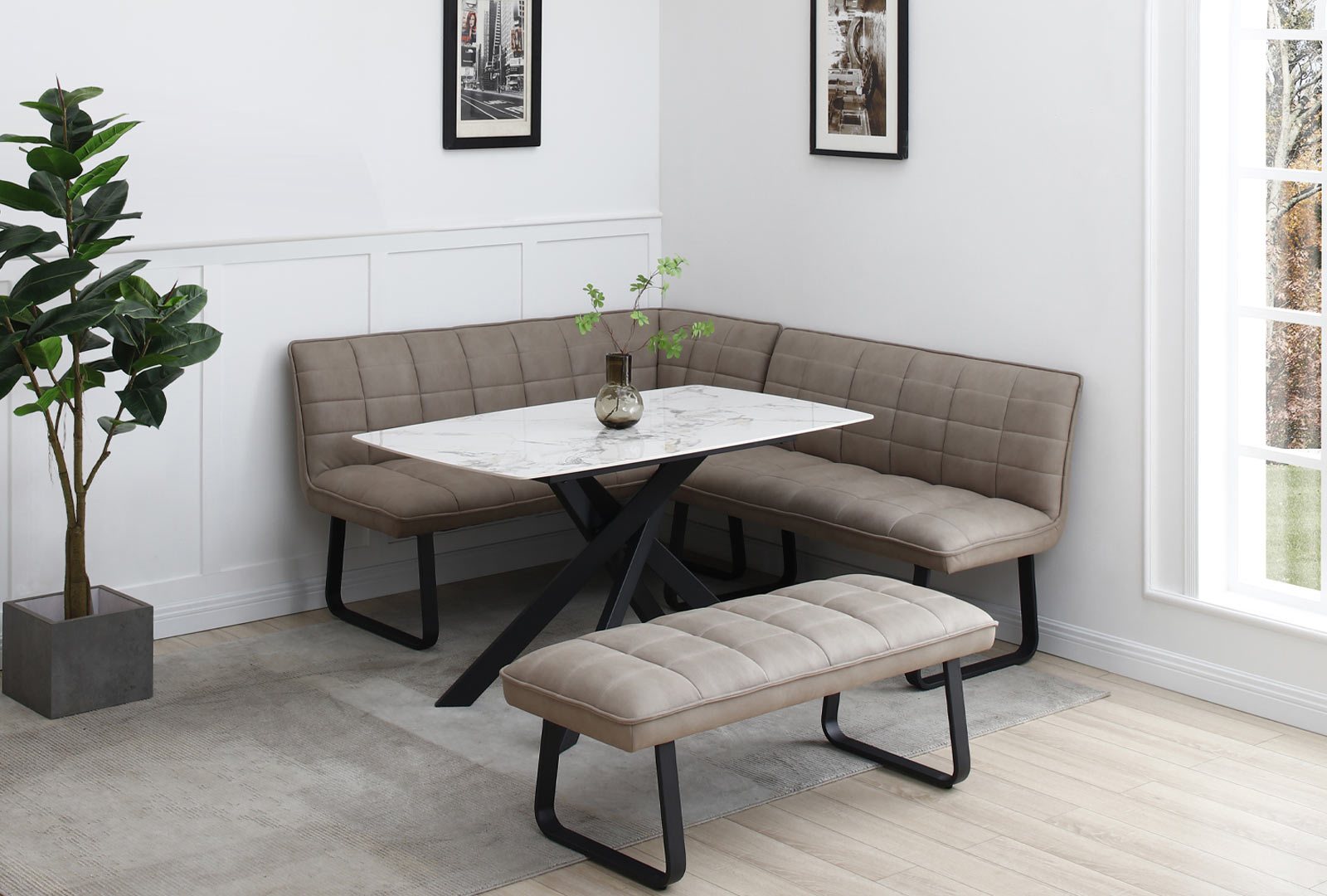 The Lindell Collection combines a minimal aesthetic with comfort and sophistication with its soft taupe fabric upholstery and sleek ceramic tables, resting on brushed black iron legs. Blending elegance and practicality, this range is a perfect addition to the modern home.