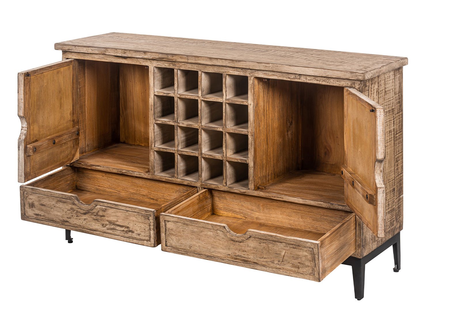 Rustic, raw, and refined—the Marlborough Large Sideboard with Wine Rack combines rich texture with bold architectural form. Angular black iron handles and feet tie the look together, blending rustic charm with industrial strength.