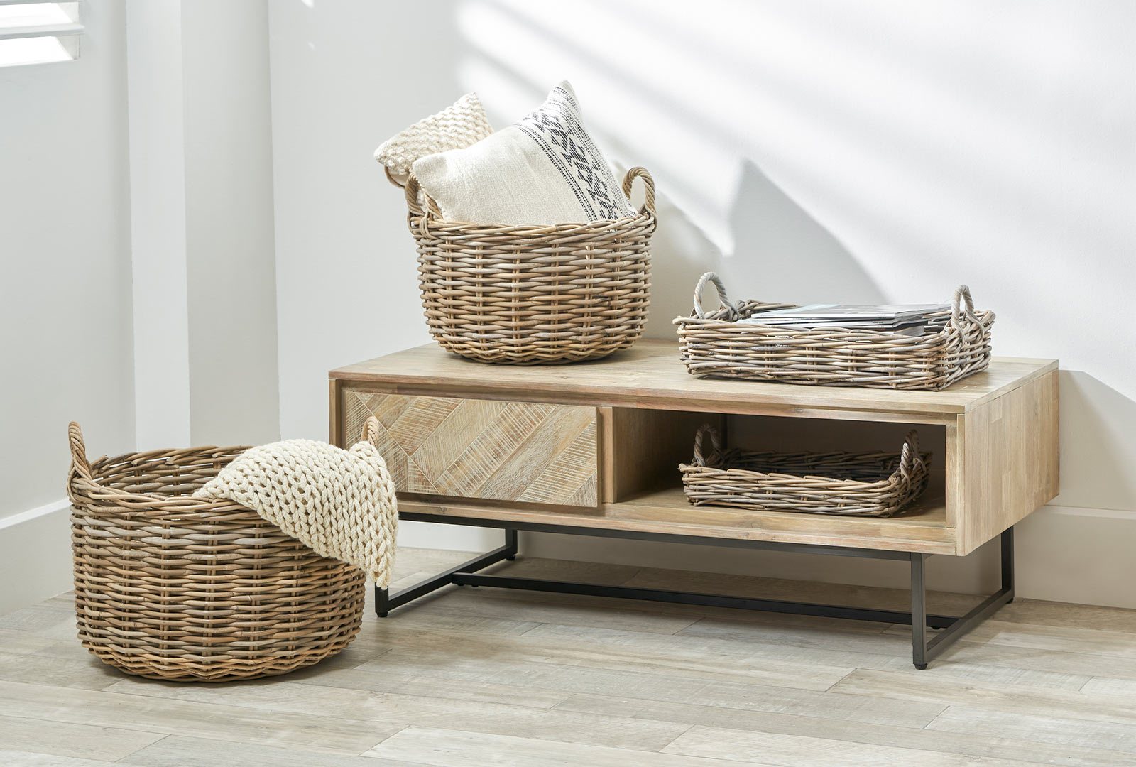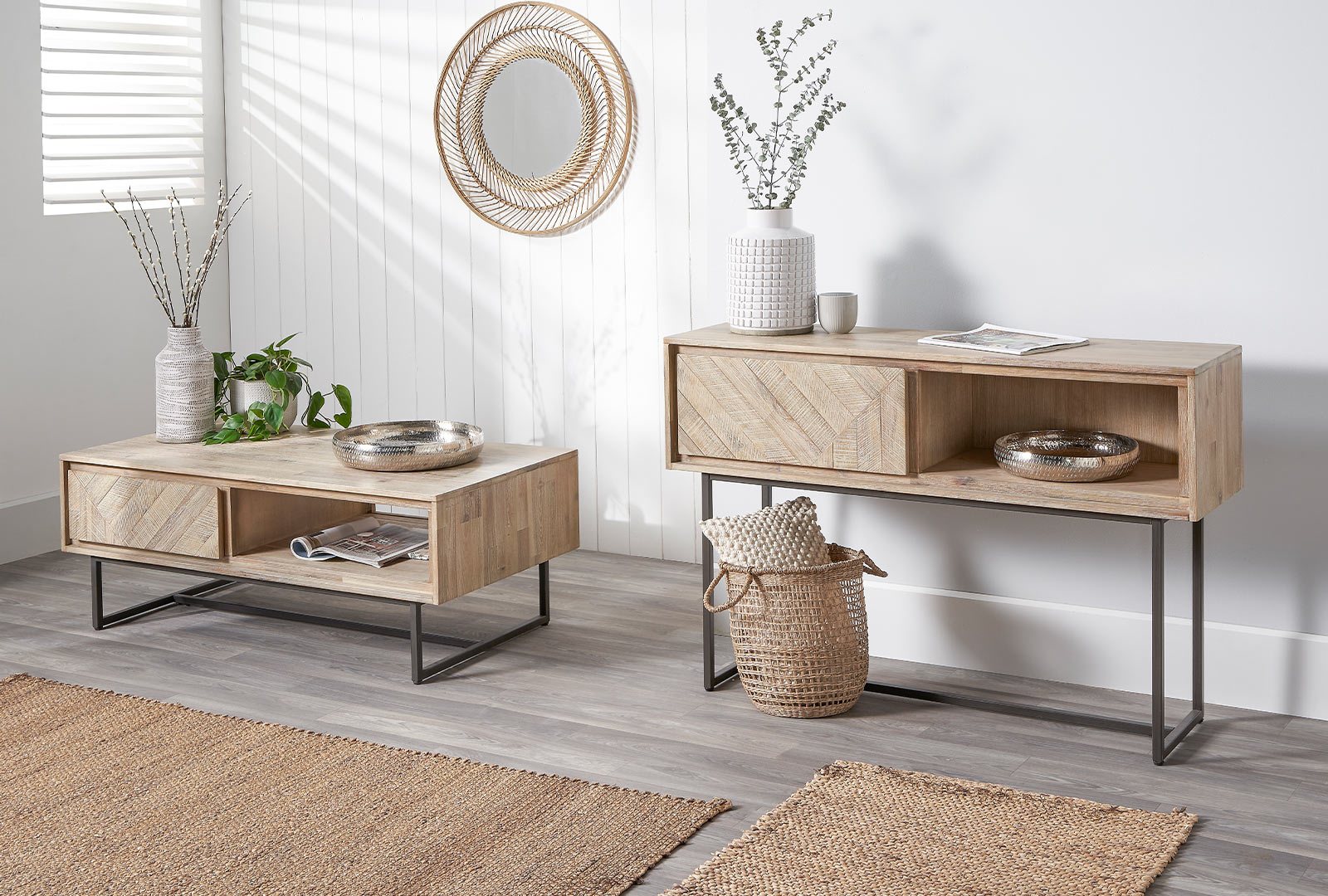 The Micah Dining and Occasional range is the epitome of Scandi styling. With acacia textured wood, panelled detailing and industrial leg in dark metal.