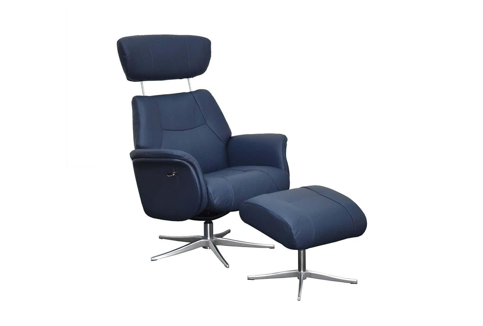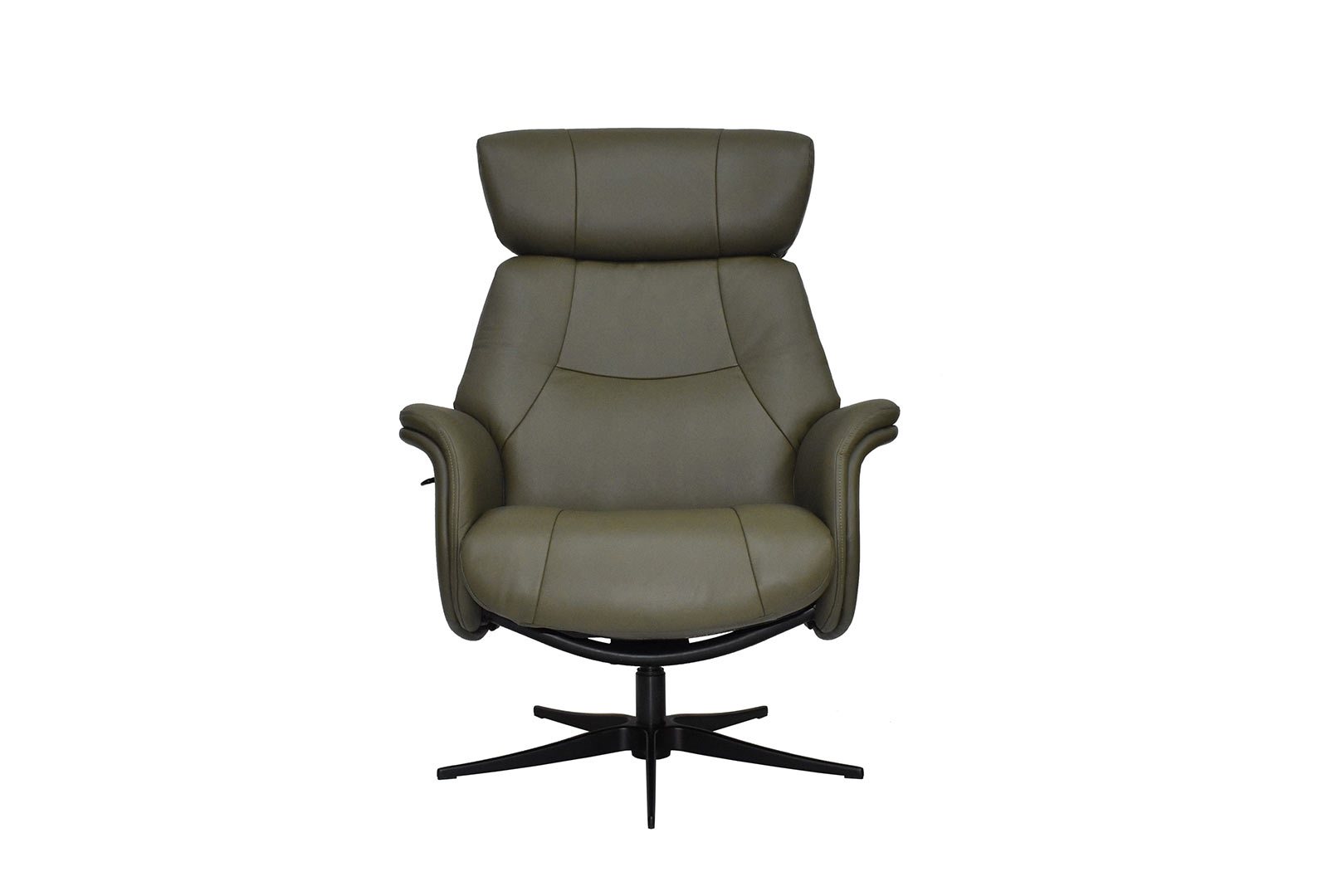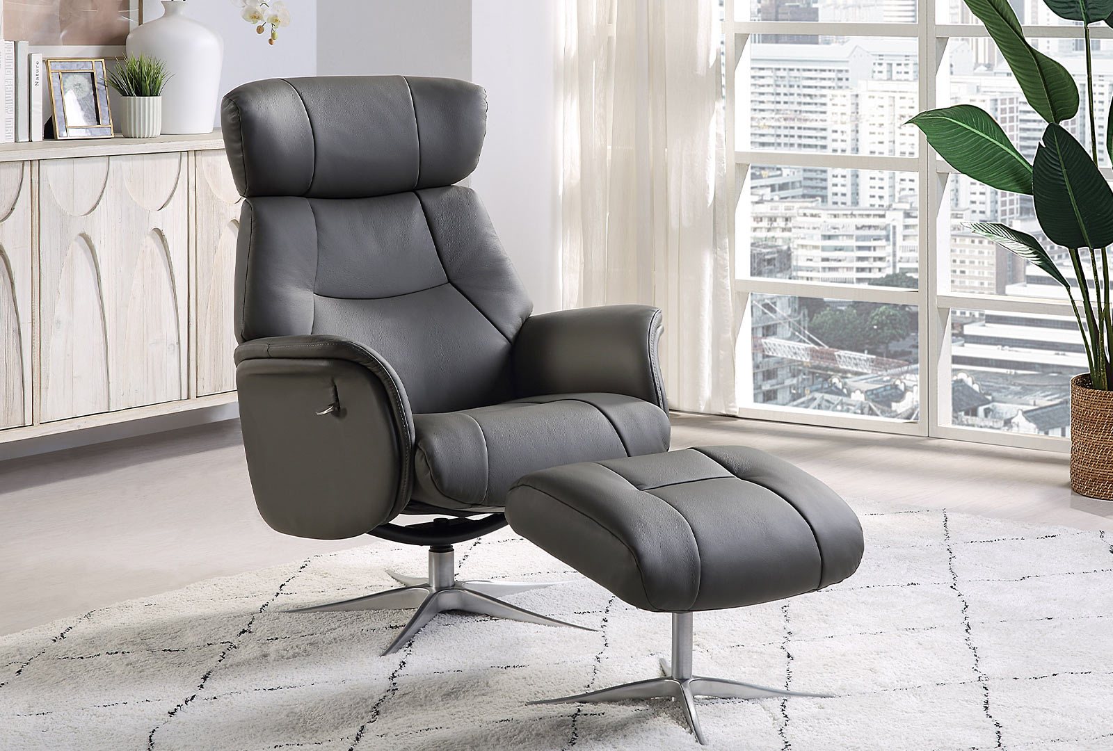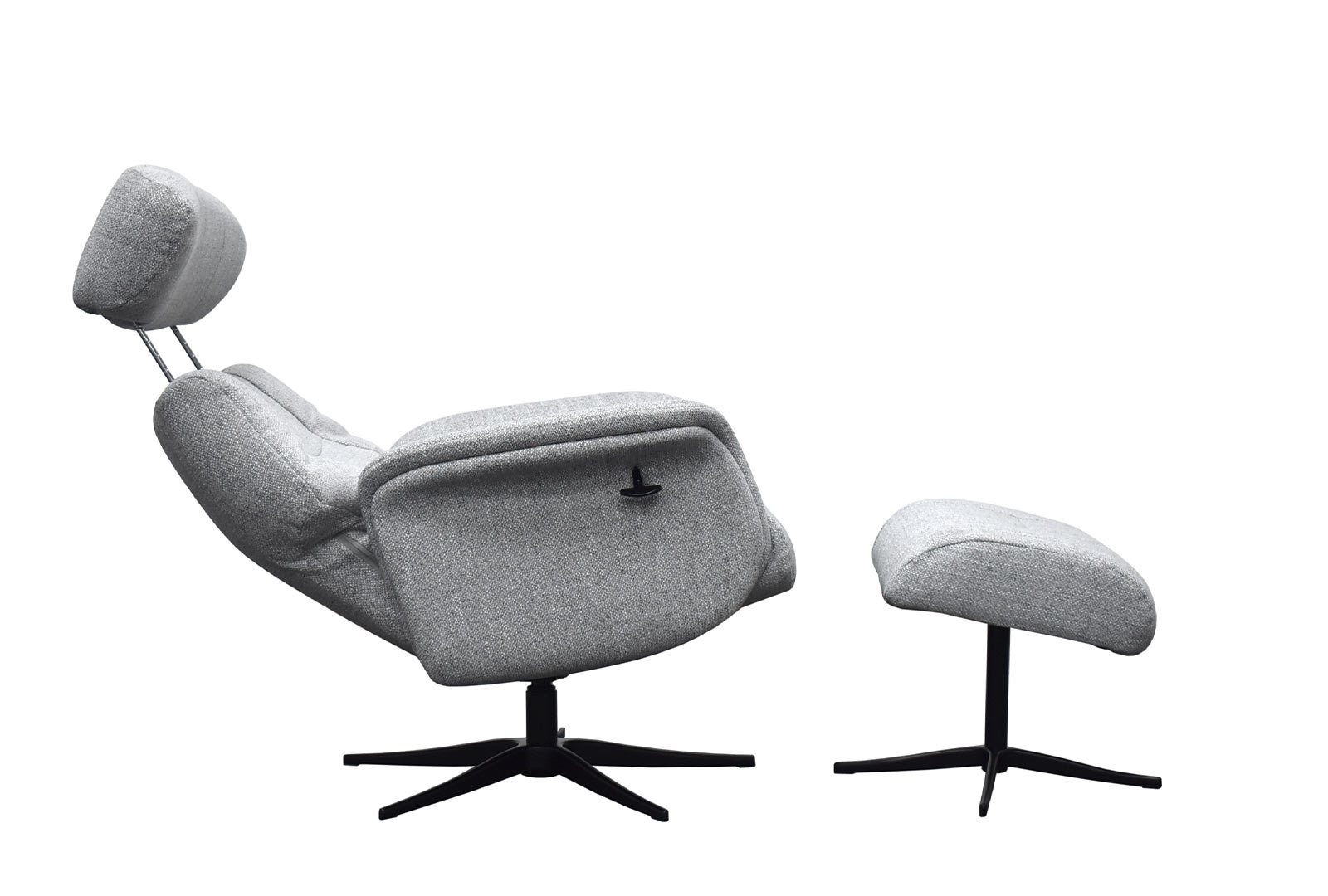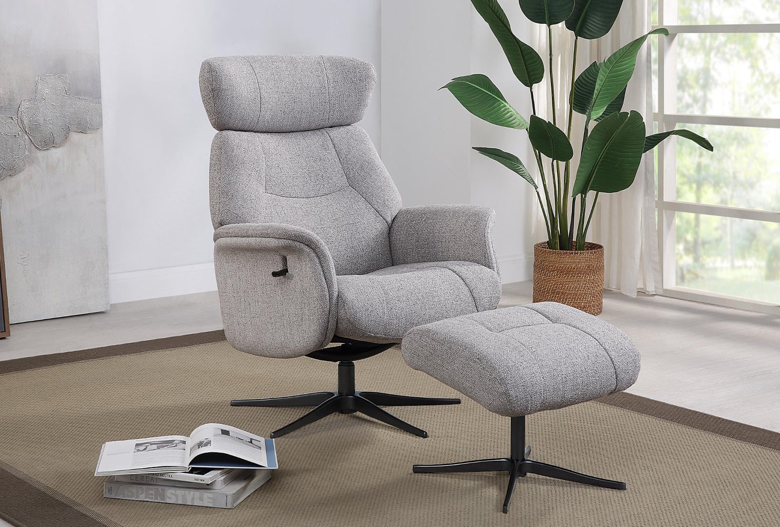 Smooth Manual Recline Action with adjustable headrest and 360 degree swivel. Footstool Included. Metal Frame with moulded foam interior.