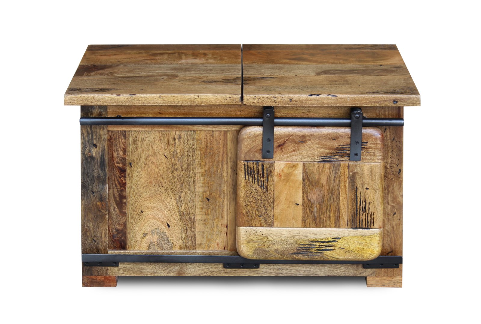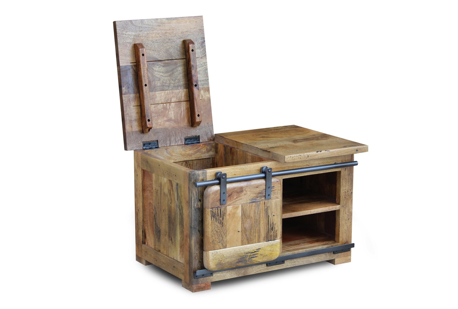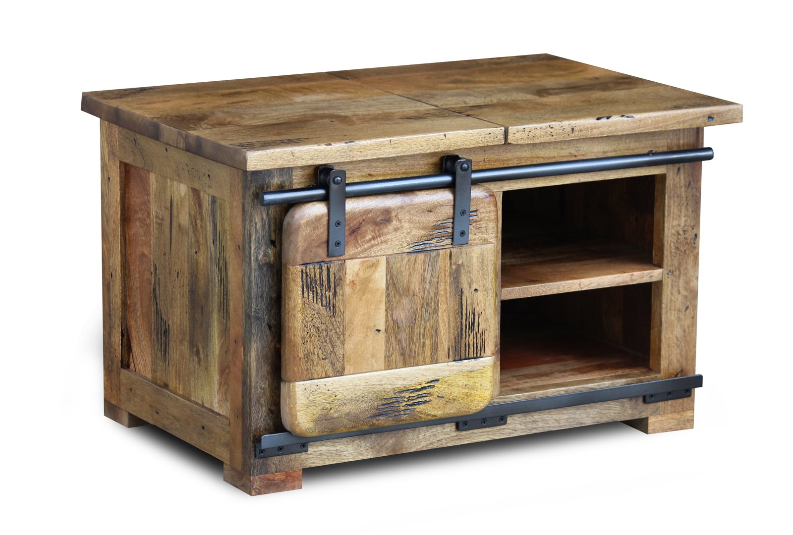 Storage and media solutions in solid Mango with a natural finish and distressed highlights. The sliding doors are a feature of this range.