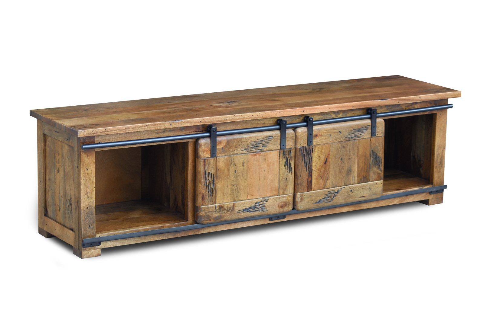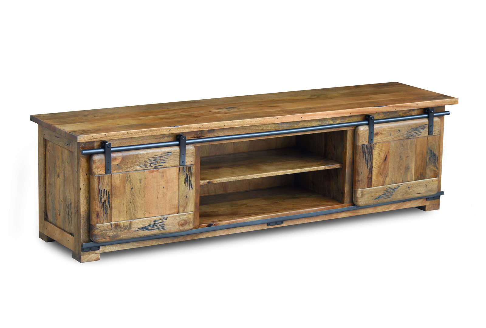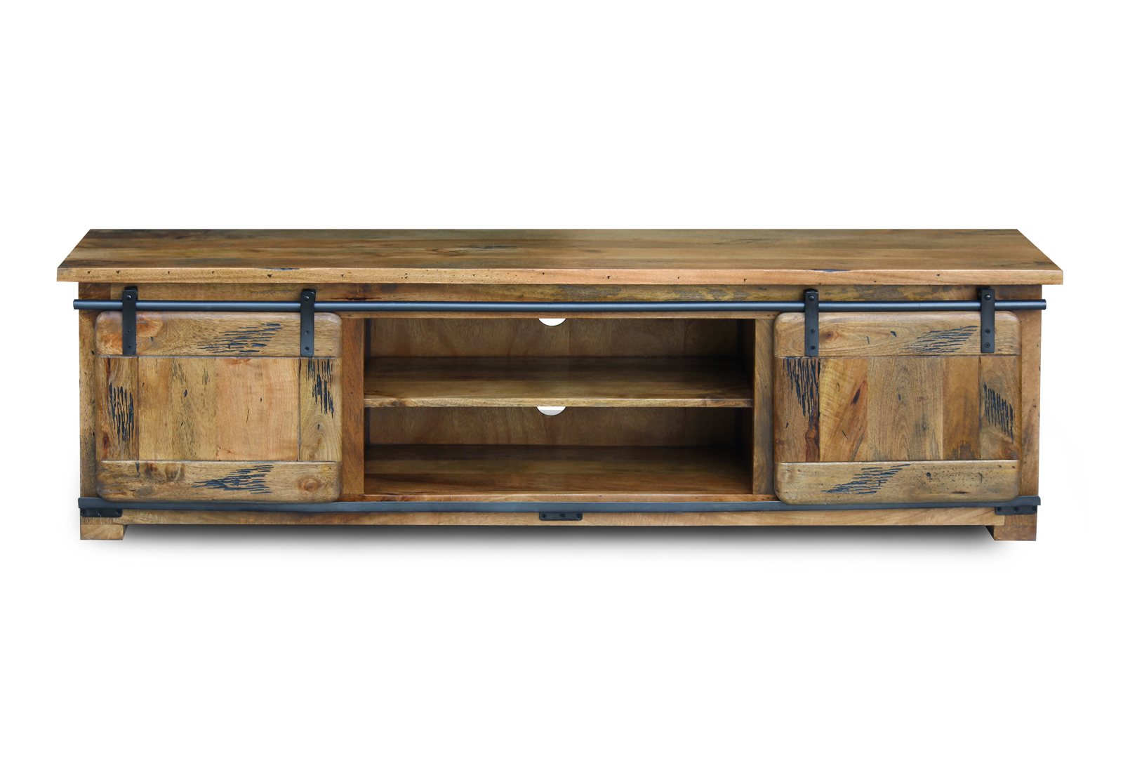 Storage and media solutions in solid Mango with a natural finish and distressed highlights. The sliding doors are a feature of this range.