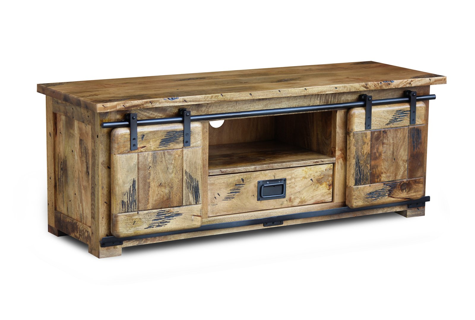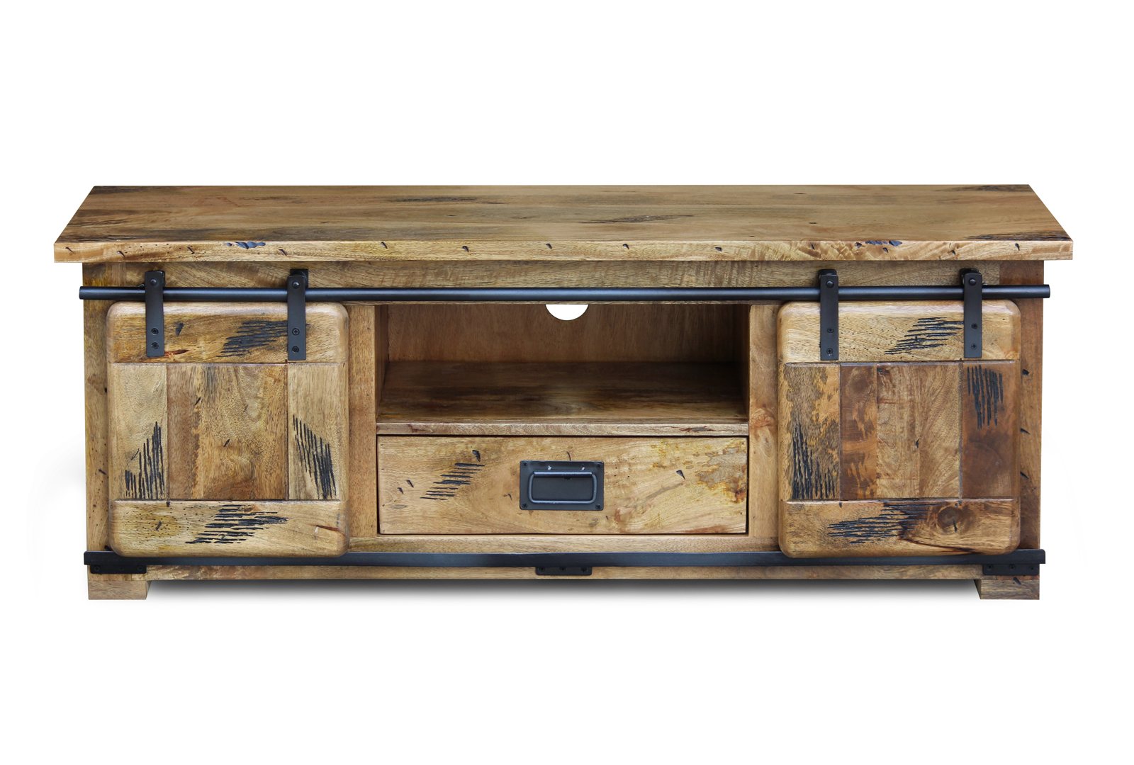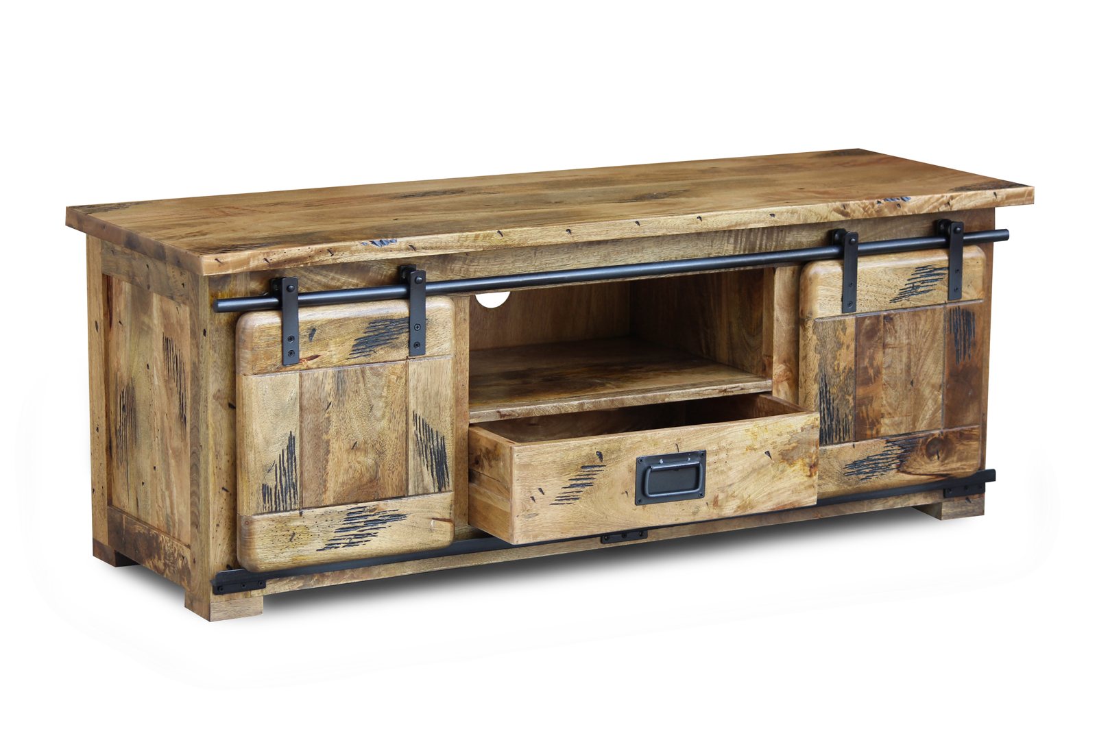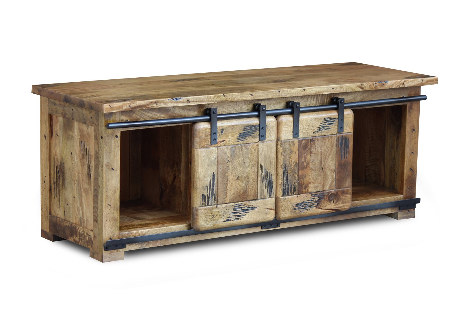 Storage and media solutions in solid Mango with a natural finish and distressed highlights. The sliding doors are a feature of this range.