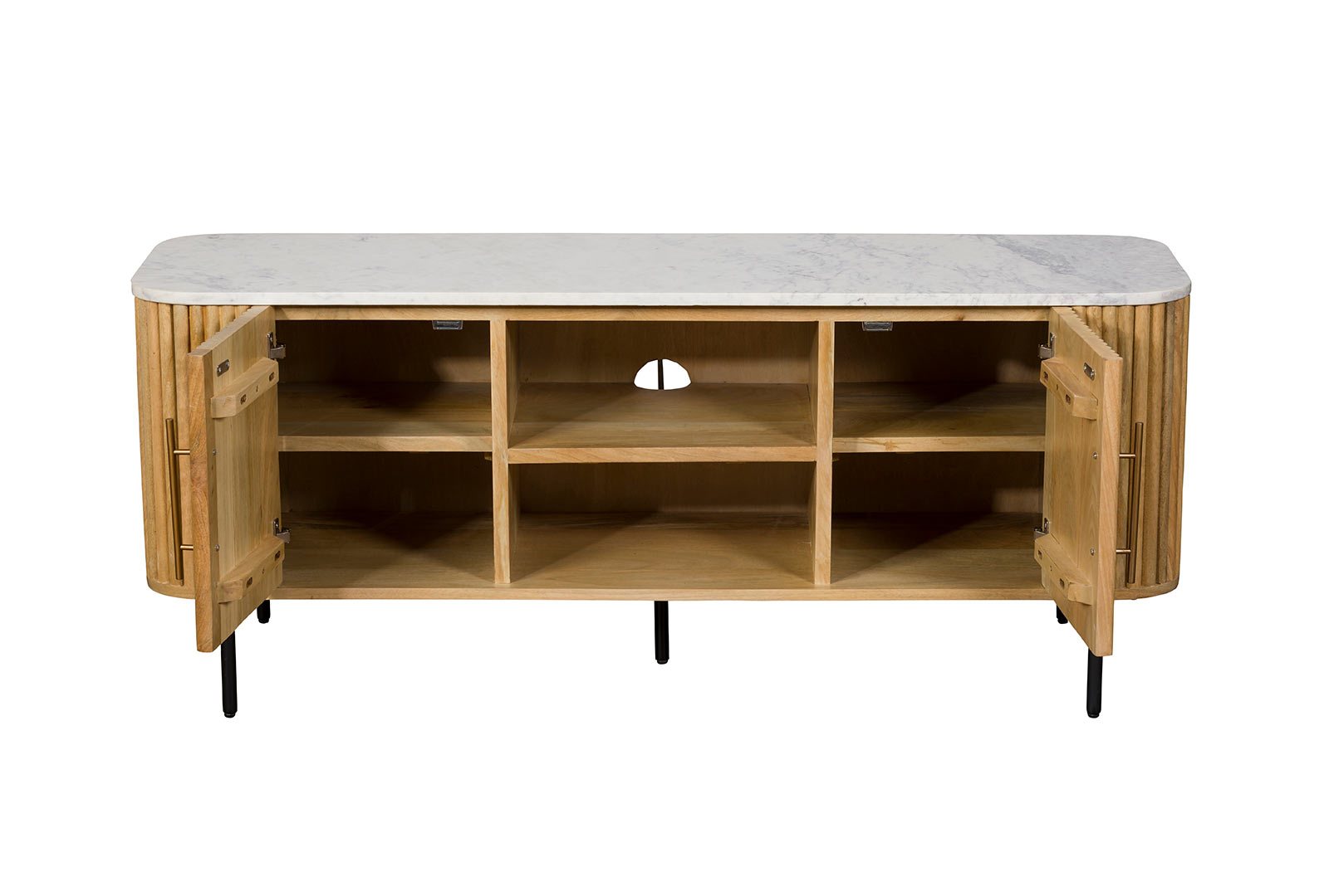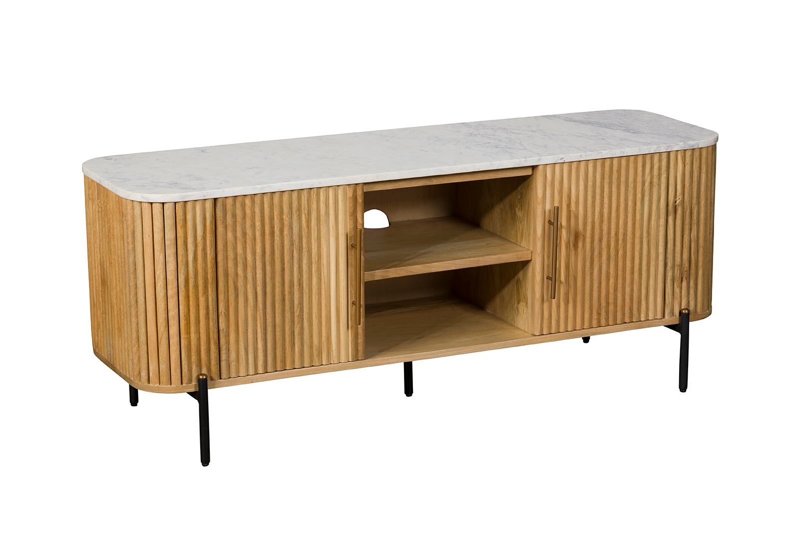 The Revue Collection features smooth natural marble tops combined with the warm tones of solid mango wood in a fluted design.