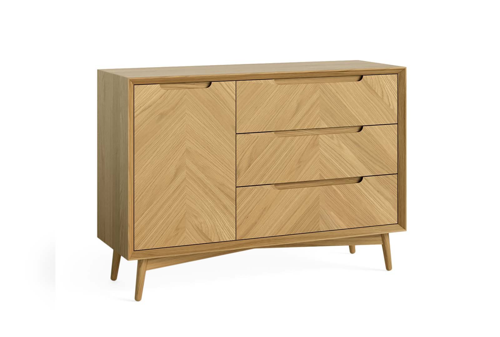 This beautifully crafted cabinet range embodies clean Scandinavian design, featuring a light wood finish, refined chevron accents and gently curved tops that add subtle texture and timeless sophistication.